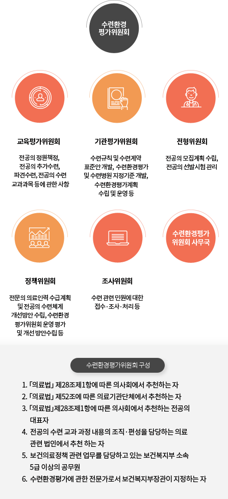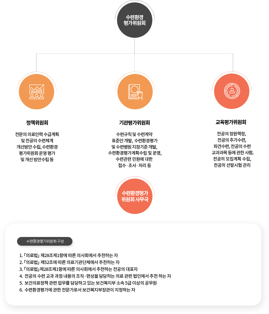 수련환경평가위원회는 위원회 산하 정책위원회, 기관평가위원회, 교육평가위원회로 이루어져 있으며